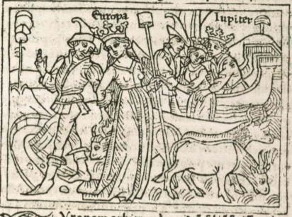 This engraving illustrates the beautiful Europa being kidnapped by Jupiter. Europa is depicted in the foreground of the engraving with a crown on her head and a long staff in her left hand. The creator engraved her name above her head in order to be identified. Boccaccio explains that Europa was following her father's heard of cattle to the shores of Phoenicia because a panderer had convinced her to do so. The panderer is depicted with his arm linked around Europa’s right arm, and him guiding her. The cattle are clustered around Europa’s feet. The background of the engraving depicts the kidnapping. The panderer lead Europa to a ship which carried the god Jupiter. Jupiter’s name is engraved above his head. Jupiter’s arms are depicted around the waist of Europa as he is lifting her onto the ship to take her to Crete.