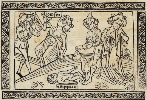 Queen Jocasta of Thebes is depicted on the right side of the engraving rubbing the tears away from her eyes with a shawl. She is crying because her husband exposed their child into the wilderness due to a prophecy which foretold the baby would grow up to kill his father and marry his mother. Her child, Oedipus, is depicted lying on the ground after being exposed. There is a shepherd approaching the baby as he takes him in and raises him as his own. Oedipus’ name is engraved beside his arm. Oedipus ends up fulfilling the prophecy by killing his father later in life, and marrying his mother, Jocasta. When Jocasta and Oedipus find out they are mother and son, Oedipus gouges out his eyes and Jocasta kills herself. This scene is depicted on the left side of the engraving with Jocasta and Oedipus’ names engraved above their heads to identify them.