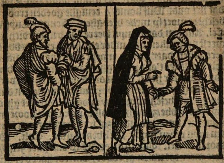 While returning home from her meeting with Melibea, Celestina spots Sempronio and Pármeno, who are going to Saint Mary Magdalene’s Church to check on Calisto, and follows them. The two servants enter first and begin talking with Calisto, while Celestina enters afterward and tells them that she has good news. They go to Calisto’s house for privacy, and Celestina reveals that Melibea is passionately in love with Calisto. Calisto is overjoyed when Celestina tells him that Melibea wants to meet him at midnight, but Sempronio and Pármeno are suspicious of Melibea’s sudden change in heart. Calisto tells everyone to leave so that he can rest before night comes, and Celestina returns home. To the right of the image, we see Celestina wearing a robe and a veil. Calisto stands beside her, wearing a coat and a hat, with a sword mounted on his belt (it can be seen protruding from behind his coat in the bottom right corner). His hung head and facial expression convey and air of sadness, which seems an unfitting depiction for this scene. To the left, we see Pármeno and Sempronio, both of whom are wearing hats. A sword is seen protruding from behind the figure on the right, who is pointing toward the figure on the left as he glances toward Celestina and Calisto.The entire image is identical to those found on pages 47 and 93 of the text.