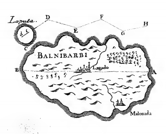 This image depicts the fictional flying island of Laputa. There are regions of hills in the Southern, and North-West areas of the island. Forests are also shown in the North-East and Central regions. The city of Lagado is in the centre of the island. The town of Maldonado is in the South-East of the island. Above the island are letters, which depict the different ways in which the island moves, hovering over Balnibarbi through magnetic opposition on an adamantine base. The same map appears in other editions of Gulliver’s Travels, including those in other languages.