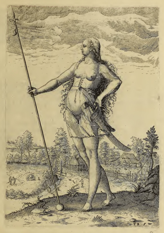 An Indigenous woman is shown from the front. She carries a spear with a ball on the end in her right hand. She wears a belted tunic that is open chested and laces under the breasts. A sword with a curved blade hangs from the belt around her waist. This woman is described as belonging to an Indigenous group that lived near the Picts. The Picts were an Indigenous group who lived in Britain long before the author’s time. Images of Picts were included in this book so that readers could compare their customs to those of the Indigenous people living in Virginia.
