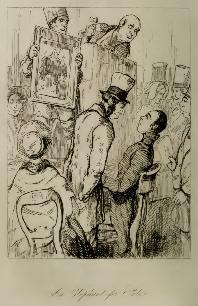 At the auction of the Sedley estate, Mr. Blowman holds up a portrait of Joseph Sedley riding an elephant to show the buyers. William Dobbin is seated directly in front of the painting, looking up with a startled expression at the bearded man looming over him. Mr. Hammerdown is peering down at the two men from the auction block, holding his mallet up. Among the figures in the background, on the right side of the picture, are Rawdon and Rebecca Crawley. Below the illustration is printed in cursive its title, “An Elephant for Sale”.