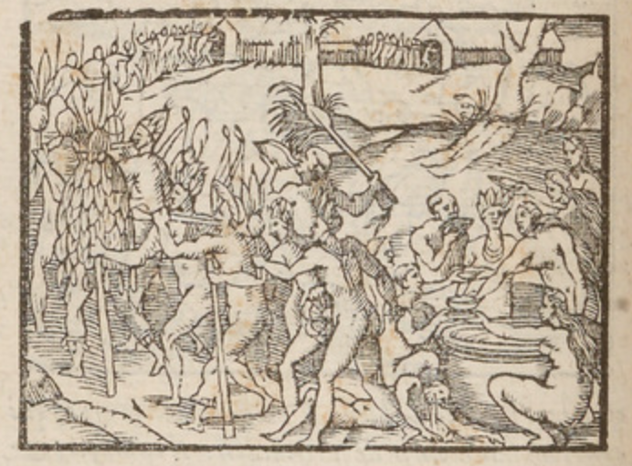 A large group of Indigenous Brazilian people take part in a long procession, possibly preceding or following a burial as part of a mourning practice. They first stop at a vat on the ground where they take a bowlful of the beverage inside. The group then proceeds towards their village and through several of the structures. Many members of the group wear feathered headdress, ornaments around their neck or waists, necklaces, and/or feathered capes. Many also carry bows, clubs, rattles, conch shells or other wind instruments, or pipes. This illustration is a simplified and mirrored version of the one found on page 83 of Paris, 1557.