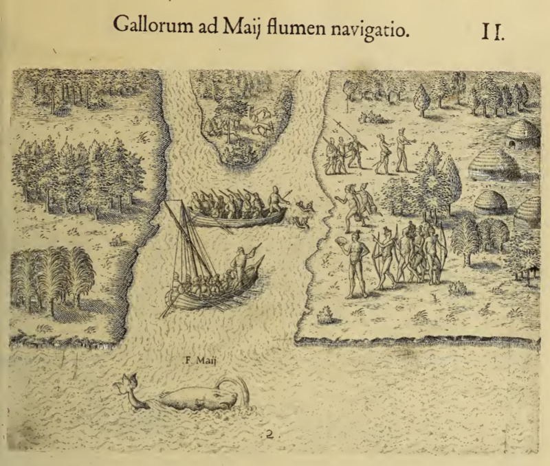 Two small rowboats of settlers are shown at the mouth of the May River (known today as the St. Johns River) on the coast of Florida. There are two Indigenous people in the water, appearing to greet one of the boats. On the right bank, a group of Indigenous people stand, some hold bows and arrows. Some are looking at and gesturing towards the colonists’ boats. Four small round structures are also pictured on the right bank.