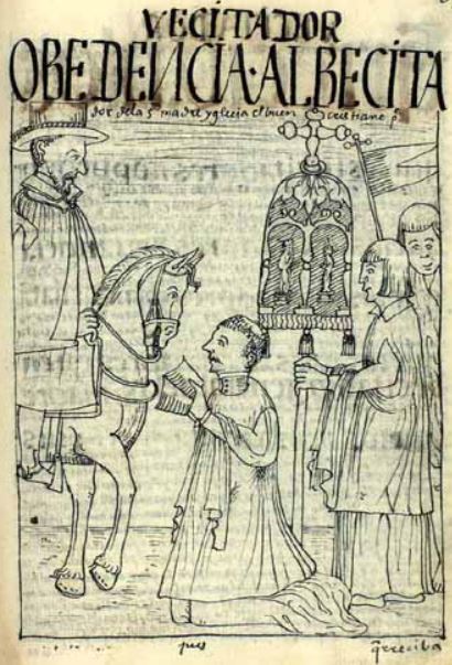 This image depicts the arrival of a Spanish pastoral inspector who is illustrated riding on his horse on the left side of the image. He is wrapped in a cloak and is wearing a hat. He is looking down at the man kneeling before him. The kneeling man is a parish priest who obediently greets the inspector as he arrives. He is illustrated holding a book. There are two indigenous men standing behind the parish priest holding ceremonial banners to welcome the inspector. One banner is intricately decorated and has a cross at the top, while the other is a smaller flag banner.