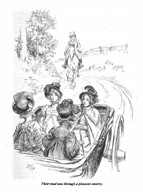 Here we see Fanny, Maria Bertram, Miss Crawford, and Aunt Norris in a carriage on their way to Sotherton, Mr. Rushworth’s estate. Edmund is riding on horseback behind the carriage. The group went to visit Sotherton estate for the day and see the house and the gardens. Maria Bertram was engaged to Mr. Rushworth. This scene occurs in chapter 8. The characters are shown in the traditional regency style. The women are wearing regency style dresses and coats with empire waists, and bonnets. Edmund wears waistcoats and tailcoats, and top hats, with breeches. The regency period dated to the early nineteenth century (1811-1820) when George, Prince of Wales, later George IV (r. 1820-1830), reigned as regent for his mentally ill father, King George III (r. 1760-1820). The regency period is associated with the rise of neoclassicism in art and fashion.