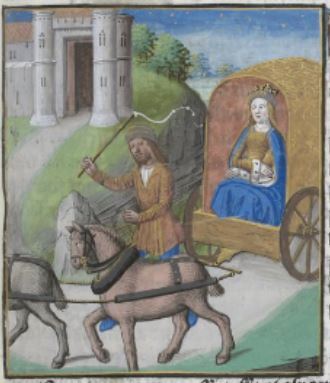 This image depicts Agrippina the Younger, the mother of Emperor Nero and wife of Emperor Claudius. She is riding a chariot in this image because, once she became wife of the emperor and titled Augusta, she rode this chariot to the Capitol, which was a tradition that only priests were able to do. Depicting Agrippina in the chariot demonstrates her power and influence in the empire.