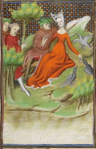 Circe is sitting in the centre of the image wearing an orange dress and a large headpiece. She was known for her magic and skills with herbs and incantations. The warrior Ulysses is depicted sitting beside Circe, with his companions standing behind him. There are birds illustrated beside Circe. Boccaccio explains that these animals are in fact companions of Ulysses, and that Circe was known to transform those who land on her shores into animals.