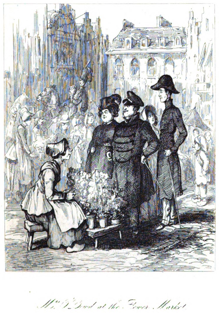 Peggy O’Dowd, in a feathered hat, stands in front of a flower seller at the market in Brussels. She is holding onto the arm of her husband, Major Mick O’Dowd, who has on a cap and is wearing his sword at his hip. Behind the pair are William Dobbin, also with his sword, and Amelia Osborne, who is in a bonnet and looking up at Dobbin. The flower seller is in a bonnet and clogs, seated on a low stool behind the table which holds her rows of potted plants. In the background of the image are the crowds of shoppers, another flower seller standing at her table of plants, a mounted officer holding a bouquet, and the tall, ornate buildings that surround the market square. Below the illustration is printed in cursive its title, “Mrs. O’Dowd at the Flower Market”.