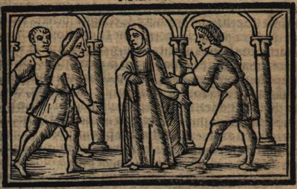 In the centre of the illustration, we see a female figure wearing a robe and a veil. There are two male figures to the left and one to the right. Because there are four female characters in Act X, we can say that this illustration does not relate to the events contained within the act.[This illustration is identical to those found in Acts IV (folio 32r), V (folio 42r), VI (folio 45r), VIII (folio 62r), XIII (folio 93v), XV (folio 102r), and XVII (folio 109r).]