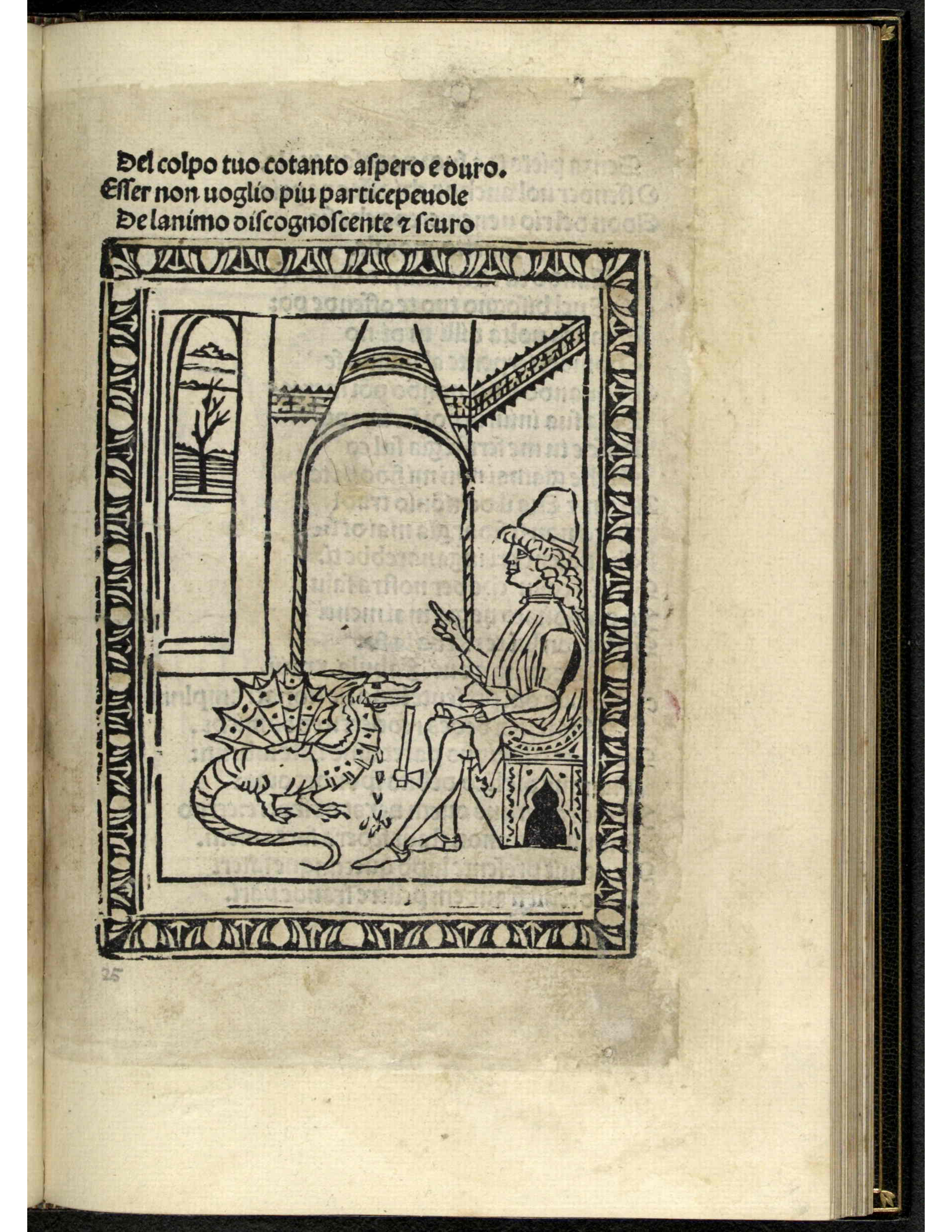 Inside a home, a man sits on a chair. He has long, curly hair and wears a tall hat. His clothing seems like those of novelty, or superiority. The man has his right hand lifted in the air, with one finger sticking out. In front of him is a small dragon on the ground, and a small axe. The dragon’s eyes are all black, and a deep cut to its neck is making it bleed out. An arch-shaped window shows a field far out.