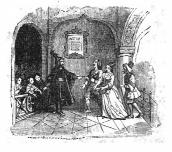 Here we see a depiction of the schools in Lilliput. The school system is a form of boarding school paid for by the Emperor, and as such interactions between children and parents is limited. The central figure is the headmaster, identified by his dark robes. Three children stand behind a gate on the left side of the image, while a man and a woman – the parents of the children – are ushered in. The headmaster holds out his arm to stop the parents from coming too close to the children, as the school limited physical contact with the children. According to Gulliver, parents were only permitted to visit their children twice a year for one hour. These visits were supervised by a teacher. Bringing gifts to the children was permitted and showing affection for them was strictly limited. This image comes when Gulliver describes the education system in Lilliput in the sixth chapter in which Gulliver discusses the values and traditions of the Lilliputians. The same image appears in the 1843 Krabbe edition.