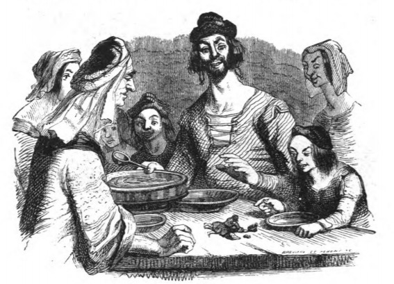 Here we see Gulliver lying on the table during dinner with the giants. The Farmer serves food from a large bowl on the centre of the table, holding a spoon. Bowls are laid out on the table in front of the giants. The farmer is in the centre of the image, with an old man across from him, and his wife behind him. The other characters in the image are the farmer’s children. Everyone is watching Gulliver. The same image appears in both the 1839 and 1843 Krabbe editions.