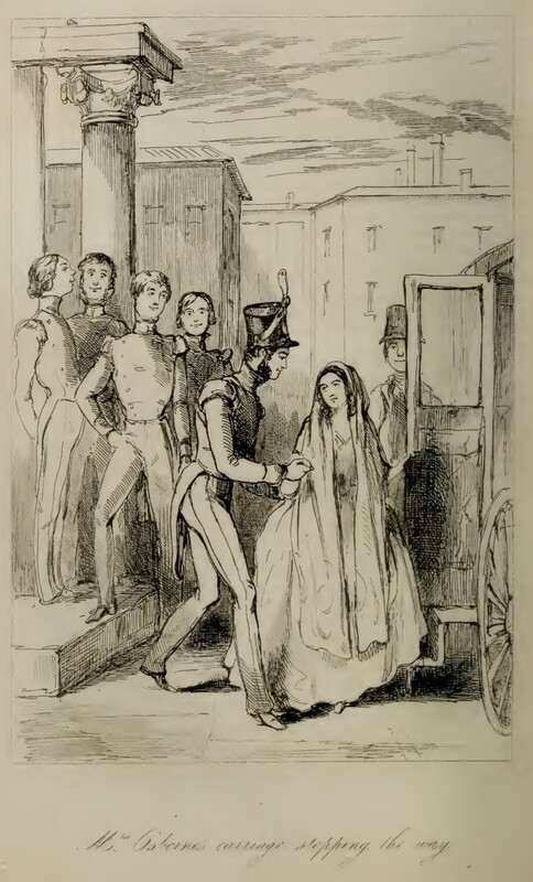 William Dobbin hands Amelia Osborne into her carriage as she leaves the ball. Behind the carriage door, the footman can be seen, and to the left of Dobbin, on the stair four young men are talking and smiling. In contrast to the others in the image, Amelia looks quite tired and sad. Below the illustration is printed in cursive its title, “Mrs. Osborne’s carriage stopping the way.”