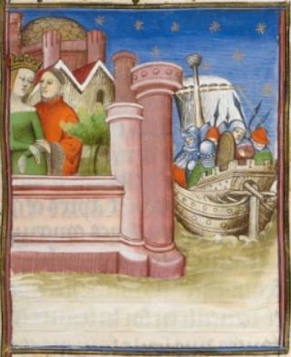 Helen, the queen of Sparta, is illustrated standing on the left side of the image as Paris, the prince of Troy, is touching her arm lovingly. Helen is wearing a crown to signify her royal status. There is a ship on the right side of the image sailing away from Sparta, which symbolizes the beginning of what would become the Trojan War, as the war is caused by Helen going to Troy with Paris.