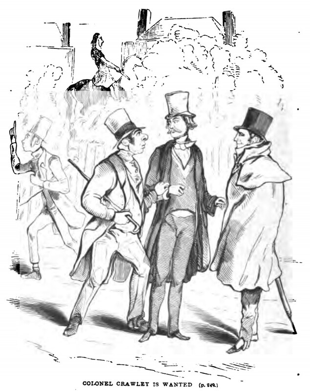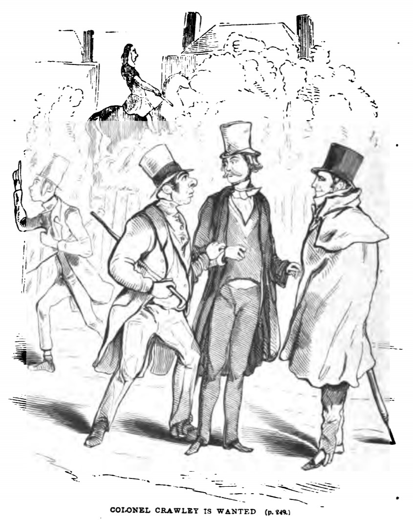 Rawdon Crawley stands with Mr. Moss and his assistant each holding one of his hands. They have come to collect his debt to Mr. Nathan. In the background Mr. Wenham, who has no money to lend him, is leaving with his hand raised and his cane tucked under his arm. Behind the men, amongst the trees, is a statue of a horse and rider. Below the illustration is printed its title and location in the story, “COLONEL CRAWLEY IS WANTED (p. 249.)”.