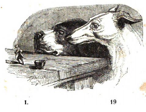 Here we see Gulliver encountering the farmer giant’s dogs. Two dogs stand at the edge of the table looking at Gulliver. The two dogs resemble a St Bernard and a greyhound. The St Bernard’s head is resting on the table. Gulliver stands on the table with his small bowl of food next to him. He leans back away from the dogs. This image highlights the difference in scale between the giant’s world and reality. The same image appears in the 1843 Krabbe edition.