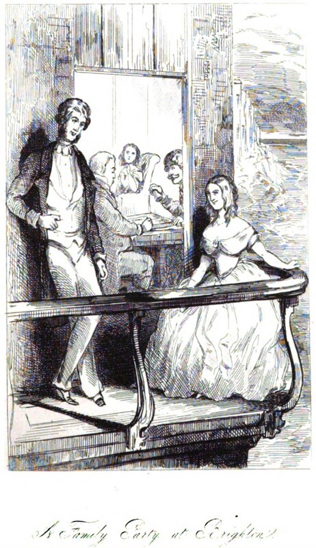 George Osborne and Rebecca Crawley are on the balcony of the inn at Brighton, looking at the ocean. He is leaning against the building, facing out, while she is seated by the railing, facing him. Through the doorway, Joseph Sedley and Rawdon Crawley can be seen inside at the table, playing backgammon. In the far background, Amelia Osborne is sitting alone in an armchair, looking forlornly at the others. Below the illustration is printed in cursive its title, “A Family Party at Brighton”.