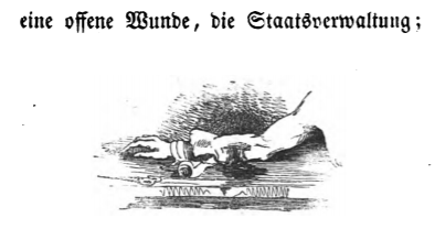 Here we see a wound that it is seeping. This is the code word for the state administration. This image comes in a description of a conspiracy found by a professor from the Grand Academy on Balnibarbi. This idea is representing code word for terms in the conspiracy that Swift is satirizing. The professor advises that those named in the conspiracy papers be closely monitored at all times, naming specifically while they were using the bathroom, as this is when men were most thoughtful. This conspiracy is thought to be an allusion to the trial of Francis Atterbury, the bishop of Rochester for allegedly plotting with the Jacobites. Atterbury was charged with treason in 1722 and was exiled to France. The same image appears in the 1839 Krabbe edition.