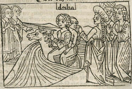 This engraving depicts Cloelia, a young Roman woman, riding a horse through a deep river with many women looking at her. Boccaccio explains that Cloelia was given to a foreign king as a hostage, and when she escaped, she took many other hostages with her to get back to Rome. While escaping, she came across a river that was too treacherous to pass. She found a horse, and despite never having ridden one, she got herself and the other women across safely by means of this horse. This image depicts her taking the other women across the river one by one as there is only one other female on the horse with Cloelia. We know that this figure on the horse is Cloelia as her name is engraved above her head.