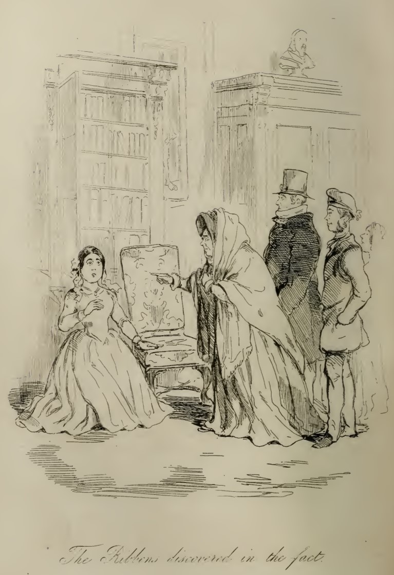 Miss Betsy Horrocks, with large ribbons in her hair, kneels in shock next to a chair in Sir Pitt Crawley’s study. Mrs. Martha Crawley, who has just caught Miss Horrocks trying a stolen set of keys on the locked drawers in the room, points an accusing finger at her. Behind her are Reverend Bute Crawley, her husband, and James Crawley, their son, who have both also witness the robbery. Below the illustration is printed in cursive its title, “The Ribbons discovered in the fact”.