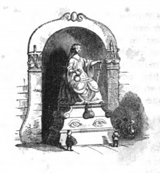 Here we see a statue depicting Justice in Lilliput. Justice is represented by a woman who holds a bag of coins in one hand and a sword in the other. She sits on a podium with two eyes on the front, one on either side, and another two on the back (the side and back eyes are not visible in this image) meaning that Justice sees everything. The podium is placed in a recessed archway with a set of scales on either side. Two Lilliputians stand in front of the statue looking up at it, while three guards stand on the right, in the shade of the statue. The same image appears in the 1843 Krabbe edition.