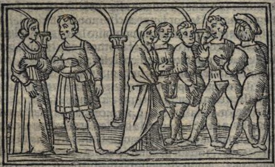 The two figures on the left are likely intended to represent Pármeno and Areusa, whom Celestina unites as a reward for Pármeno’s loyalty. To the right, we see Celestina interacting with a group of four male figures. This scene is not in any way related to the events of Act VII.[This illustration is identical to those found in Acts I (folio 9r), IX (folio 67r), XI (folio 80r), XII (folio 83v), XIV (folio 96v), XVI (folio 106v), and XIX (folio 115v).]