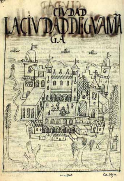 This image is depicted in the author’s chapter where he discusses cities, towns, villages, and provinces in colonial South America. This image depicts Huamanga, Peru. The city is arranged in a cluster of buildings that forms a square in the centre of the town. There is a fountain illustrated in the square with people walking around. There are birds flying over the city and four trees illustrated in the foreground of the image. There is a pathway on the bottom right side of the image and one on the left side of the image, both leading into the city. The author claims that his father was the founder of this city. The caption at the bottom of the image reads “ciudad” [city].