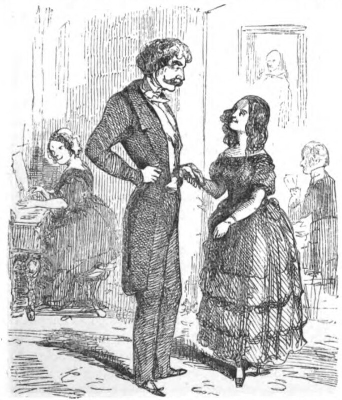 Captain Rawdon Crawley and Rebecca Sharp are in the center of the image, hand-in-hand as they perform a country dance. Mrs. Martha Crawley, Reverend Bute Crawley’s wife, is playing the piano in the background with a smirk on her face. Through the opening to the next room, a portrait hanging on the wall and a man playing cards can be seen.