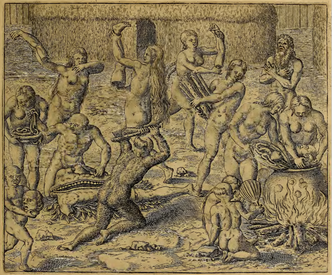 A human torso with both arms, head and one leg removed lies face down on the ground. One Tupinambá man removes the innards from an incision along the spine and sets them on a plate held by a woman while another man prepares to remove the final leg using a small axe or hatchet. Around the body three women hold the two arms and one leg, and a child holds the head. To the right there is a large pot set over a fire, and two women add innards and a head to the pot while another brings more firewood. A bearded European man stands behind the fire with his arms crossed over his chest, observing the group.