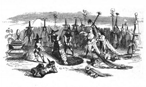 Here we see a Lilliputian burial ceremony. The deceased is buried head down because the Lilliputians believe that the world will eventually turn upside down and the dead will be resurrected, thus when this happens, they will be right side up. The burial is attended by a crowd of mourners. This image appears when Gulliver discusses the various traditions and practices of the Lilliputians. The same image appears in both the 1839 and 1843 Krabbe editions.