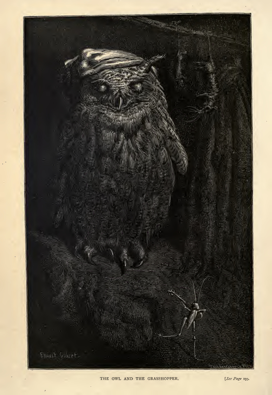 A large owl is standing on a tree trunk. The owl's eyes are glazed over, almost as though it was blind. The owl wears an old-fashioned sleep hat. Next to the owl, on the right side, a branch crosses over its head and two insect-looking creatures hang from a small piece of rope. In front of the owl, at the foot of the tree trunk, a grasshopper stands wide stance, holding what seems to be a very small guitar.
