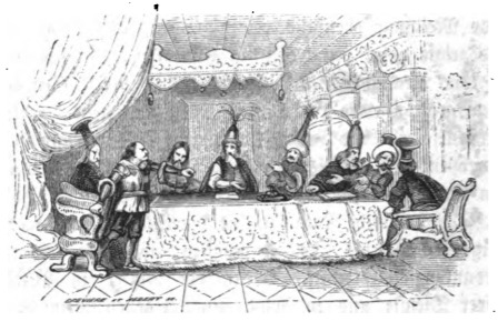 In this image we see a group of seven Lilliputian court officials and the Emperor at a table discussing Gulliver’s fate. Some argue that Gulliver should be pardoned or given a less severe charge than treason because of his work in defeating the Blefuscudian fleet during the war between Lilliput and Blefuscu. The Grand Admiral, however, insisted that Gulliver should be put to death because of his actions, specifically urinating on the Imperial Palace. The Grand Admiral is the second figure from the left in this image. He is wearing part of a suit of armour and does not wear a hat. The Emperor sits in the middle of the table, and can be identified by his headpiece with several large feathers coming out of the top. The men are seated in a large hall in the Imperial Palace. The throne can be seen in the distance behind the Emperor as can a row of columns on the right side and a large curtain on the left. The same image appears in the 1843 Krabbe edition.