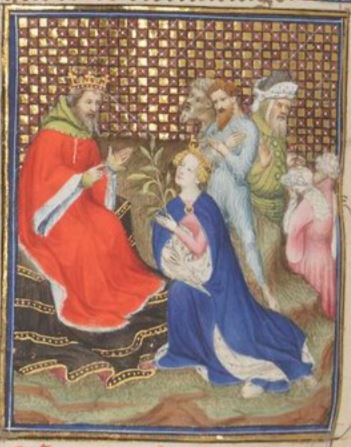 This illumination depicts Nicaula, the queen of Ethiopia, on the right side of the image meeting King Solomon of Jerusalem. King Solomon is illustrated wearing a red robe and a crown. Nicaula, as Boccaccio explains, was incredibly wise and wanted to hear and listen to the wisdom and intellect of Solomon. She had traveled from Ethiopia to Jerusalem to meet him. Nicaula is depicted kneeling and presenting King Solomon with a balsam tree. She has servants behind her carrying more gifts that she brought for the king.
