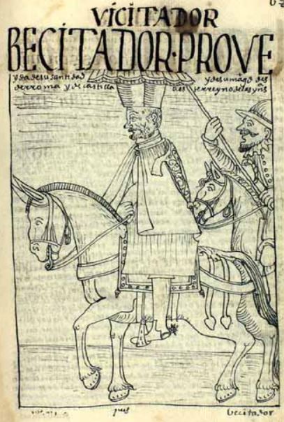 This image depicts a general inspector of colonial Peru riding a horse in the centre of the page. He is elegantly dressed and is adorned in a cloak and hat. He has an assistant riding behind him while holding an umbrella over his head to protect him from the sun. This general inspector was sent to the Indies by the Pope to inspect each bishopric office. The author explains that this man was chosen to be an inspector for twelve years and was required to be a good, charitable, honourable, Christian man.