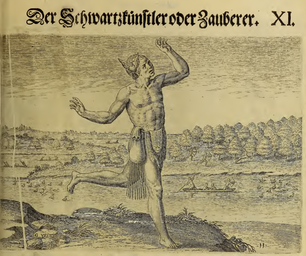 An Indigenous man, called an enchanter by the author, is shown standing on the bank of a river. He wears a black bird in his short hair as a symbol of his position. His only clothing is a hide tied around his waist, and a satchel hangs at his side. Behind him, other Indigenous people are seen in a canoe, hunting water birds with a bow and arrow.