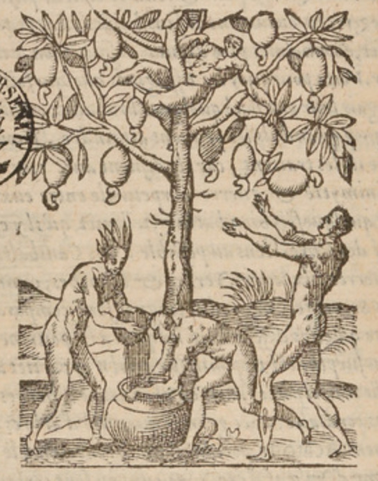 Four Indigenous Brazilian men pick and gather fruit from a tree. One man has climbed the tree to pick fruit and drop it down into the arms of another man on the ground. Two other men at the base of the tree gather the fruit and put it into a basket for transport. This illustration is a simplified and mirrored version of the one found on page 120 verso of Paris, 1557.