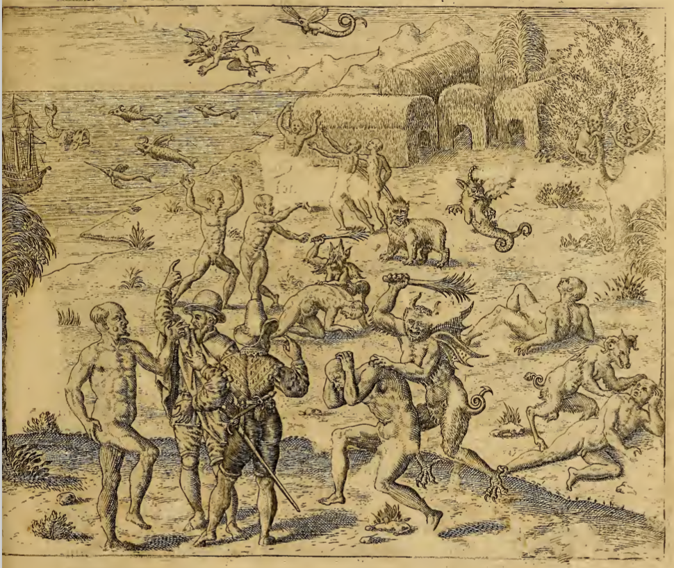 Two European men stand in the foreground with a Tupinambá man, all three gesture as if having an argument. Beside the group another Tupinambá man runs with his hands over his head, pursued by a winged demon with horns, a curly tail, and talons for feet. The demon has one hand on the man's back holds a switch raised above his head. In the background, other fearsome creatures torment Tupinambá people. The creatures may be based on the spiritual beliefs of the Tupinambá. There is also a village in the background, and a European ship anchored near the coast on the left.