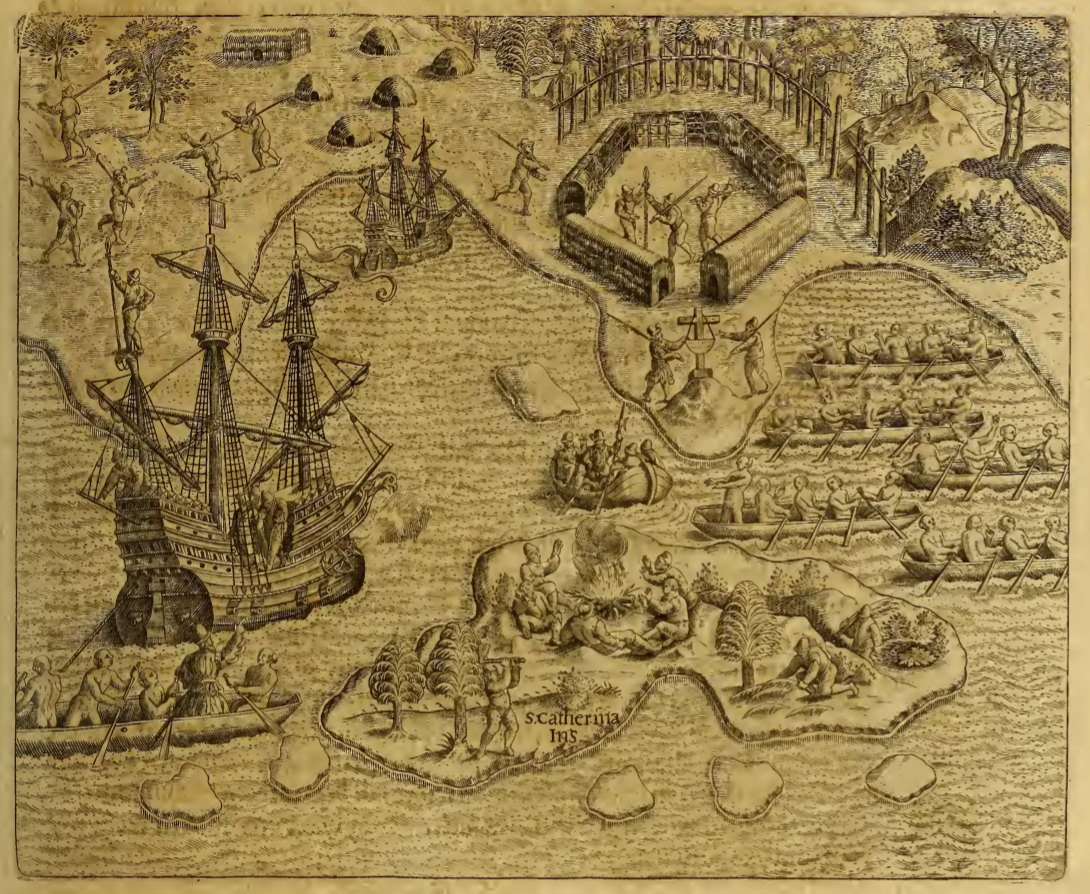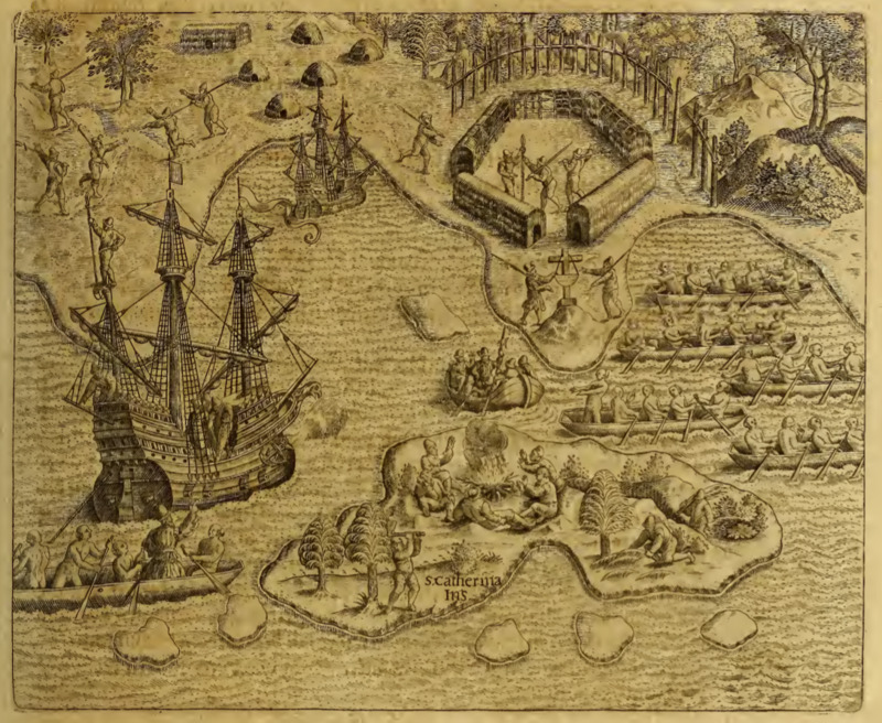 Two European ships are anchored near the coast, close to an island labelled ‘S. Catherina Ins.’ Several European men sit around a fire on the island, while others chop down a tree and gather brush. A canoe bearing several Tupinamá men and one European approaches the island from the left and five other canoes come from the right, with the five heading towards a rowboat filled with European men. On land several European men with spears explore an abandoned Tupinambá village near the shore. The frames of several of the structures are exposed and parts of the fence are broken. A large cross with a plaque hanging around it has been erected on the cape near the village and two European men stand beside it.