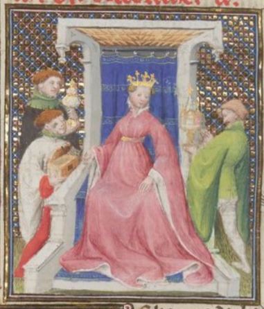 This illumination depicts Queen Joanna of Jerusalem and Sicily sitting on a throne with her subjects surrounding her. She is depicted wearing a crown to demonstrate her royal status. Her subjects appear to be handing her gifts. Boccaccio explains that Joanna was a praiseworthy subject to write on as she was an impressive ruler which was not common for women during her time.