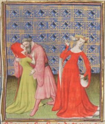 This illumination depicts Scipio Africanus, a Roman general, committing adultery with a young servant girl on the left side of the image. The woman on the right side of the image is his wife, Tertia Aemilia. She is depicted looking away after discovering her husband and his mistress as they commit adultery. Instead of confronting her husband about the affair, she devises a plan to get rid of the mistress. Tertia Aemilia married the young servant girl off to a freedman. She does this so that no one finds out about the affair so that it does not ruin her reputation. Boccaccio explains that he chose to write on Tertia Aemilia because the way she handled the affair and how she used her cunning was admirable.