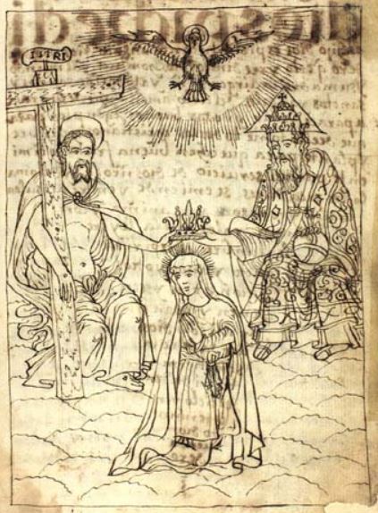 This illustration depicts the virgin Mary in the centre of the image. She is kneeling with her hands in prayer as she is crowned by both the son of god (on the left) and by god (on the right). Jesus is holding a cross to symbolize his crucifixion, and there are holes in his hands and feet to also further demonstrate his sacrifice, God is depicted resting his hand on an orb which signifies his power over the world. The holy spirit is depicted as a bird in the sky above Mary’s head.