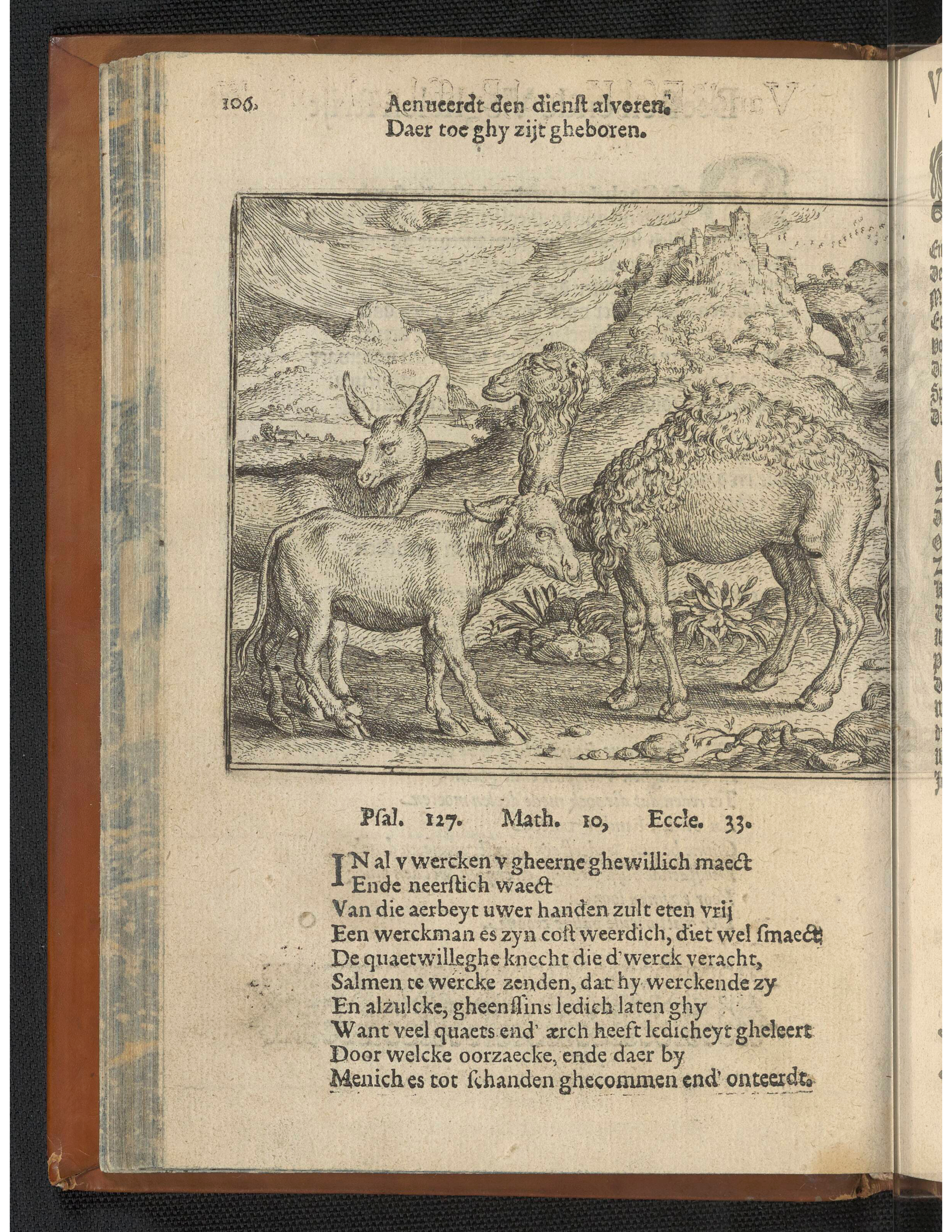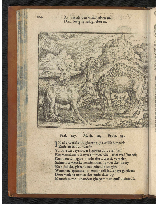 The donkey, camel, buffel and mule'; a camel, mule and donkey standing in a landscape; Dutch letterpress on verso; illustration to Eduwaert de Dene's edition of Aesop's Fables, De Warachtighe Fabulen der Dieren (Pieter de Clerck, Bruges: 1567). c.1567Etching
