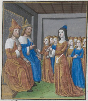 This illustration depicts Niobe, queen of Thebes, on the right side of the illustration with her many children standing behind her. Niobe had many sons and daughters with her husband, king Amphion of Thebes, which made her incredibly proud. Boccaccio explains that when the city of Thebes was making sacrifices to Latona, the mother of Apollo and Diana, Niobe declared that she is more worthy of the sacrifices than Latona because she had more children than her. Niobe is depicted arguing this to two male (most likely noble) citizens of Thebes in the illustration, who seem discontent with her statements. Niobe eventually was punished for speaking against the Gods by having all her children die.