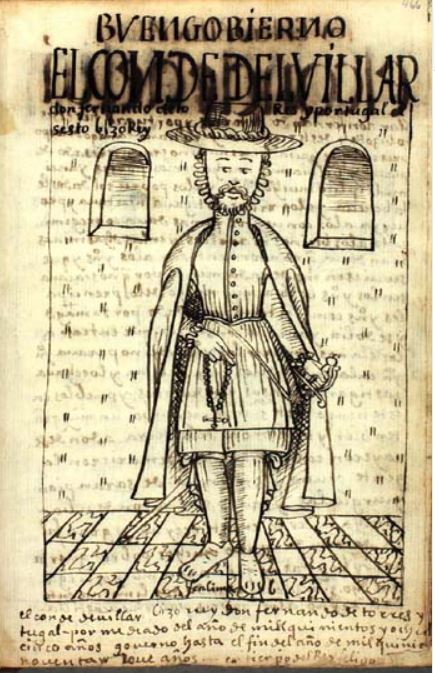 This image depicts a standing portrait of the Count of Villar and sixth viceroy of Peru, Don Fernando de Torres of Portugal. He is illustrated standing upright as he holds the hilt of his sword with his left hand and a rosary in his right. The author describes this viceroy to be a friend of the poor and a good Christian man. The large caption at the bottom of the image reads, “el conde de uillar, don fernando de torres y [por]tugal, por mediado del ano de mill quinientos y ochen[ta y] cinco anos gouerno hasta el fin del ano de mil quinien[tos] nouenta y [nu]eue anos en tienpo del rrey felipo [el segundo]” [the count of Vilar, Don Fernando de Torres of Portugal, governed in the middle of the year 1585 until the end of the year of 1599 in the time of King Philip II].