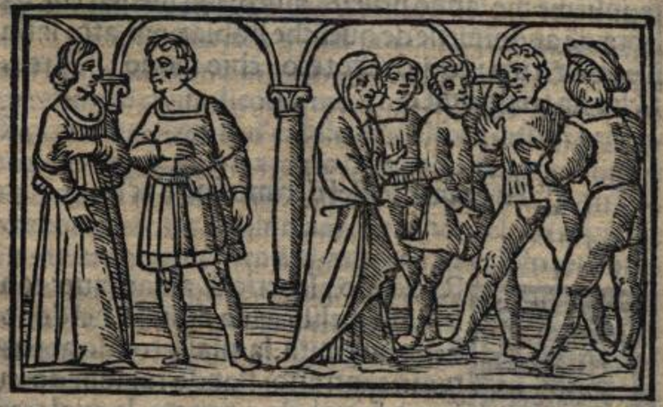 On the left side of this illustration, we see a male figure and a female figure off by themselves, the latter of which is wearing a robe. These two figures likely represent the scene in which Melibea’s parents, Pleberio and Alisa, discuss the possibility of finding a husband for Melibea. To the right, we see a female figure wearing a robe and a veil. She is interacting with a group of four male figures. This scene has no apparent relation to the events portrayed in Act XVI.[This illustration is identical to those found in Acts I (folio 9r), VII (folio 52v), IX (folio 67r), XI (folio 80r), XII (folio 83v), XIV (folio 96v), and XIX (folio 115v).]