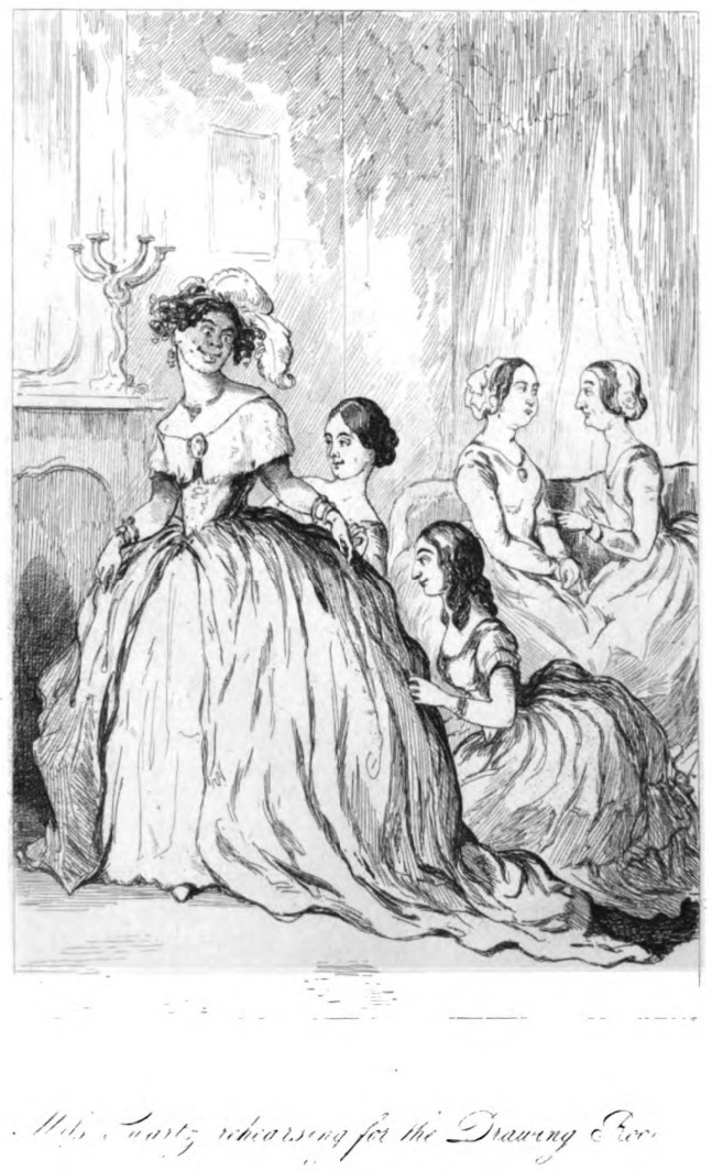 Miss Rhoda Swartz stands in front of Jane and Maria Osborne, dressed in a large gown with many pieces of jewelry and feathers in her hair. In the background, Miss Wirt and Miss Swartz’s chaperone Miss Haggistoun are seated on a sofa, talking to each other. Below the illustration is printed in cursive its title, “Miss Swartz rehearsing for the Drawing-Room.