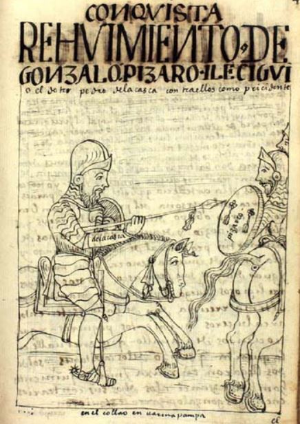 This chapter focuses on discussing the arrival of Spaniards and the Spanish conquest of Peru. This image depicts the forced surrender of Gonzalo Pizarro, who is illustrated riding a horse on the far right of the image. Pedro de la Gasca is illustrated riding a horse on the left side of the image and pointing a spear at Pizarro. Pizarro’s name is written on his shield to identify him, and Pedro de la Gasca has his name written on his right gauntlet. They are both illustrated suited in European armour.