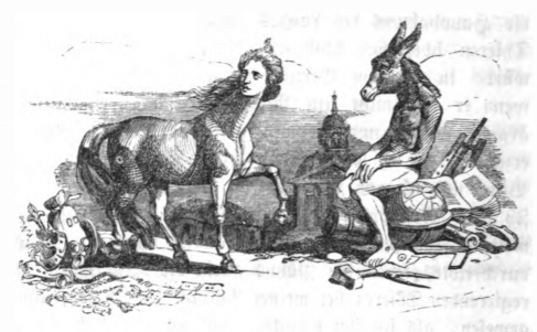 This image serves as a satire on the relationship between the Houyhnhnms and the yahoos. The Houyhnhnms are shown with the body of a horse and the head of a human, representing their intelligence. The yahoo is shown with the head of a donkey and the body of a human. The image represents how their society was flipped from what Europeans were accustomed to. The yahoo sits on a globe, with various scientific and artistic instruments surrounding him. The same image appears in the 1843 Krabbe edition.