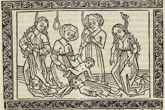 This engraving depicts the wives of the Cimbrians (a northern tribe) killing their children and hanging themselves. After their husbands were defeated in war against the Romans, the wives pleaded to their enemies for mercy and to let them become vestal virgins. When the Romans denied their request, they decided to kill their own children and hang themselves to save their virtue and to not die at the hands of their enemies. Some women in the image are depicted with the nooses around their necks, and one woman is depicted killing her child before killing herself.